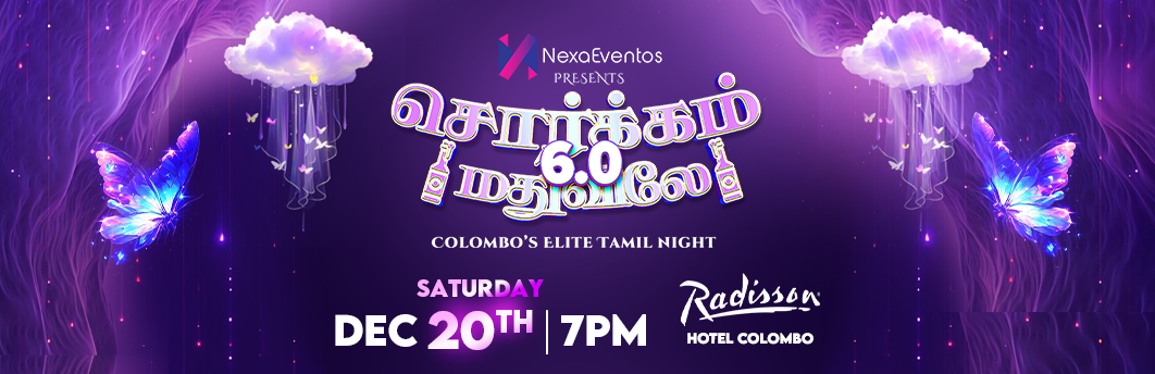 Sorgam Madhuvilae 6.0 – Colombo’s elite Tamil rooftop party is back! Get ready for a night of pure class and energy with DJs spinning the hottest Tamil beats under the city lights. A premium vibe, a stunning view — this is where Colombo’s elite come to party!